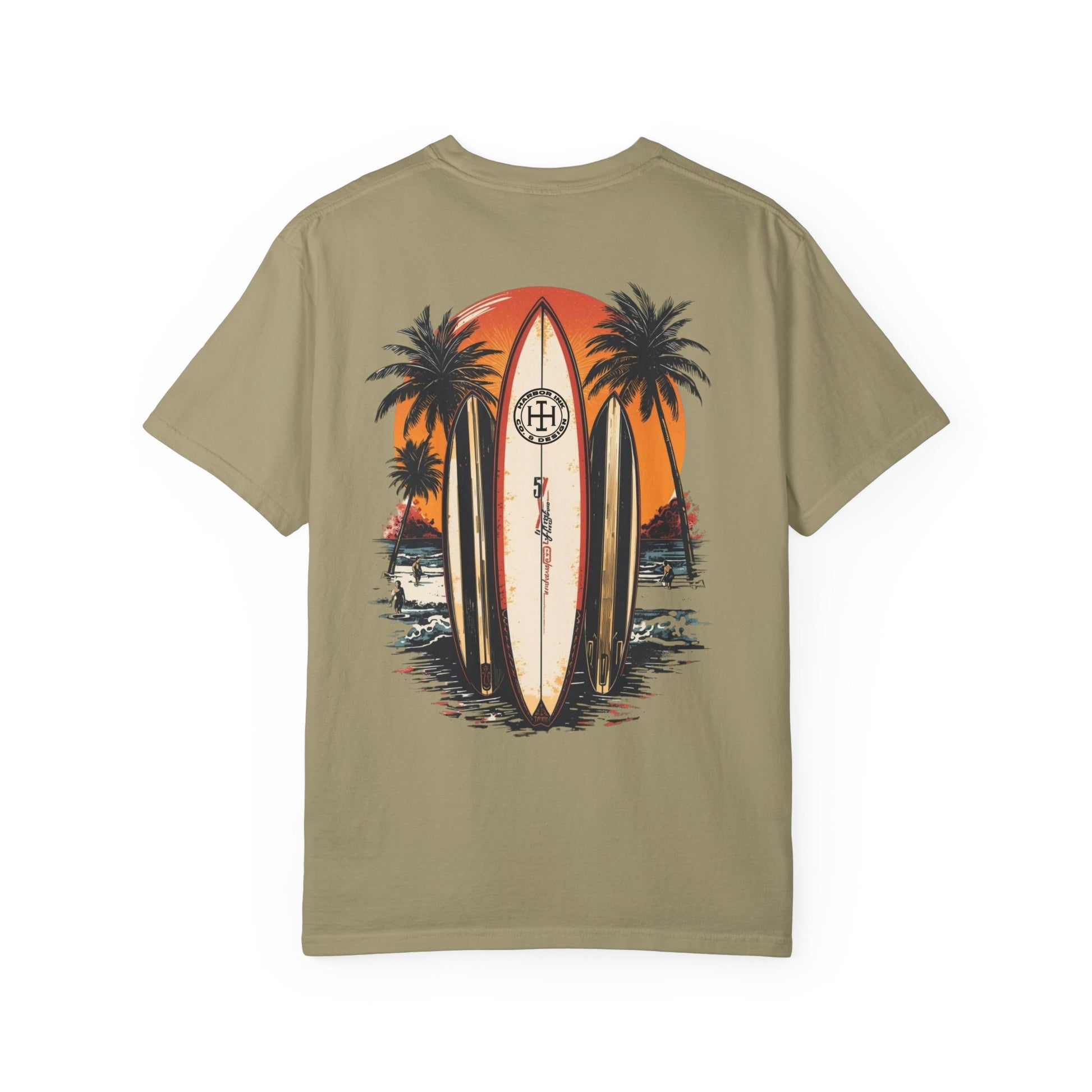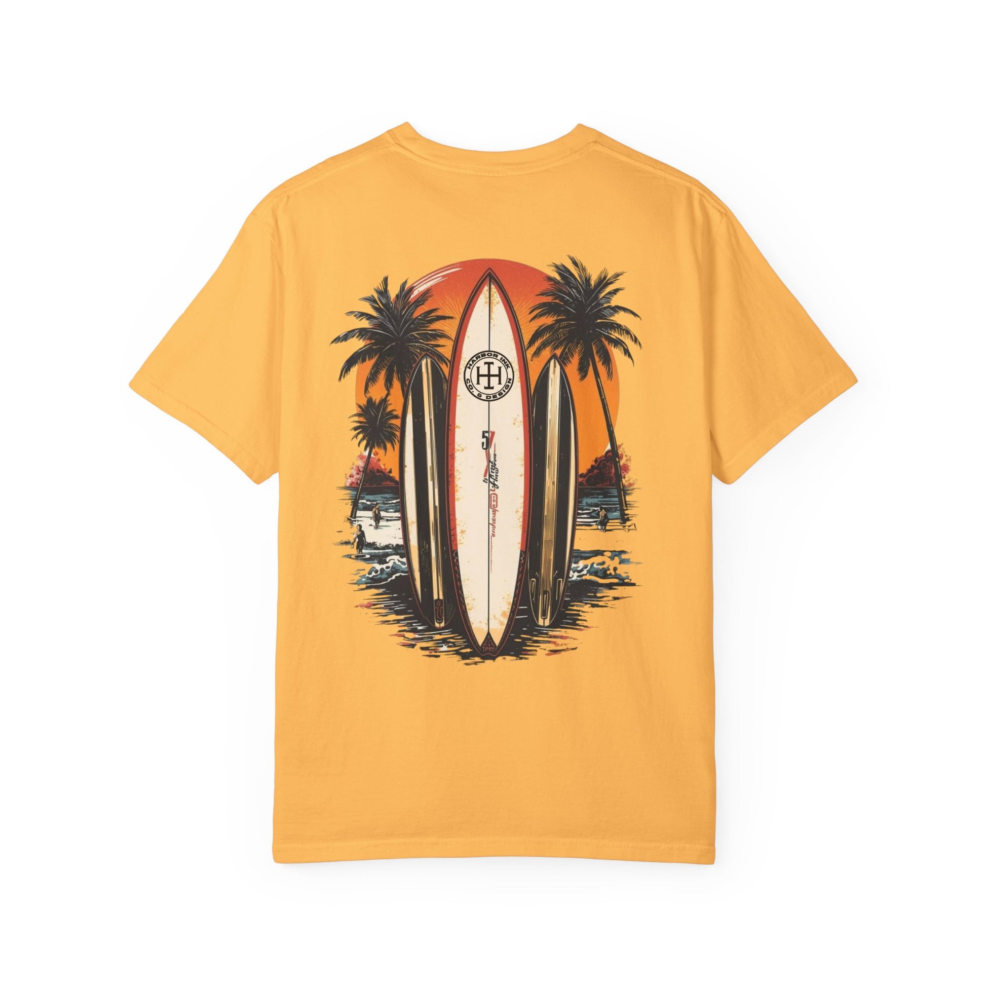 Catch the last light and ride the perfect set with the Sunset Surfboards Tee. Featuring three vintage longboards standing tall against a fiery coastal sunset, framed by palms and shoreline vibes, this design channels pure surf culture with Harbor Ink Co.’s signature edge.