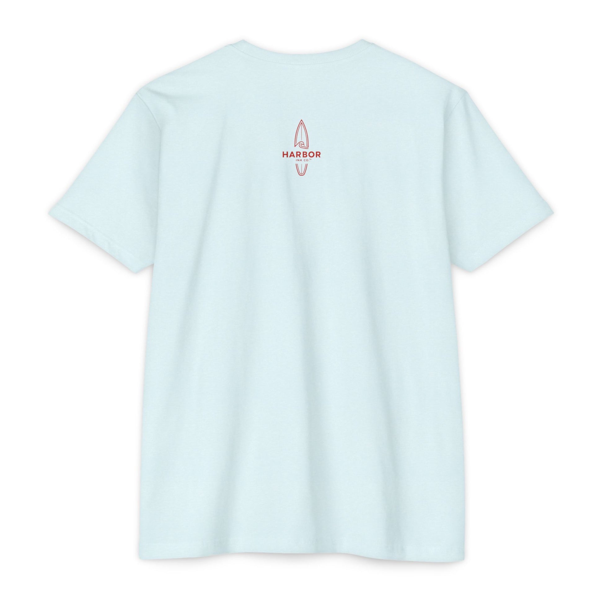On the back, a red Harbor Ink Co surfboard logo sits centered beneath the neckline, adding a bold signature that ties the design back to the harbor.